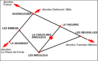 Vous pouvez aussi accéder à la Chaux-des-Breuleux par la route venant de l'étang de la Gruère. Sur la route principale qui relie Tramelan et Saignelégier, une route secondaire mène à la Chaux-des-Breuleux. La bifurcation se situe au niveau du parking de l'étang de la Gruère.